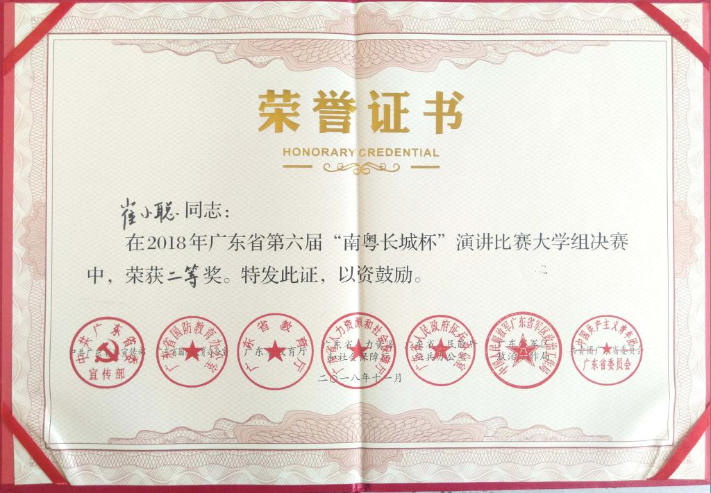 11月25号下午,以“传承红色基因,汇聚强军力量”为主题的广东省第六届“南粤长城杯”演讲比赛汇报演讲暨颁奖仪式在中山大学举行。我校人文学院17级语文教育专业崔小聪与叶书琴两位同学分别喜获二等奖和三等奖,我校首次荣获“优秀组织奖”。