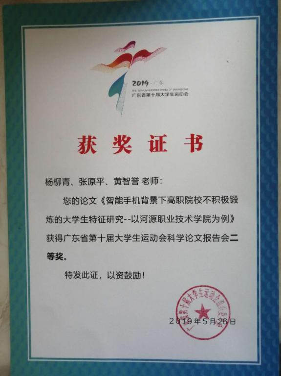 根据《广东省教育厅关于举办广东省第十届大学生运动会科学论文报告会的通知》(粤教体函﹝2019﹞4号)文件精神,我校体育教研室组织教师积极参与,共有11人撰写的22篇论文送审至由深圳大学承办的科报会。本届科报会共收到相关单位报送论文1377篇,获奖572篇(一等奖48篇,二等奖212篇,三等奖312篇)。经专家评审、查重和评审委员会确认,我校有3篇论文获奖,其中杨柳青老师的《智能手机背景下高职院校不积极锻炼的大学生特征研究——以星空在线(中国)唯一官方网站为例》和《校园体育文化的特色引领与建设路径研究》分别获得二、三等奖,殷国龙老师的《论散打侧踹腿技术训练及运用》获三等奖。同时,杨柳青老师获邀参加了此次科报会,就获得二等奖的论文进行了汇报和答辩,与全省体育同行们对高校体育教育等方面进行了深入细致的研讨。