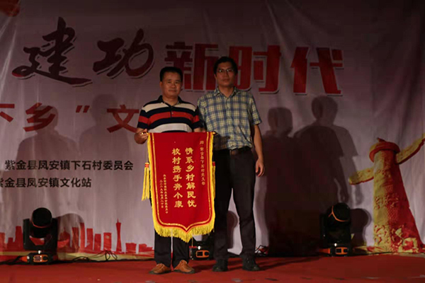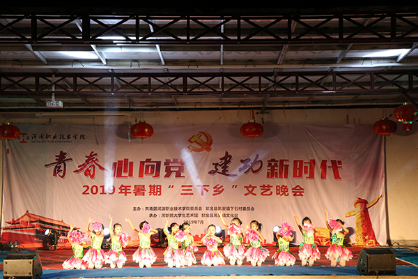本次晚会以“青春心向党,建功新时代”为主题,践行习近平新时代中国特色社会主义思想和党的十九大精神,通过歌舞、小品、朗诵等节目为村民们带来了一场精彩的表演。晚会在我校筑梦乐团《自由的世界》《没有什么不同》中拉开序幕;由下石幼儿园以及下石小学学生表演的歌舞《留守的孩子》《唱花儿的花儿》以朝气蓬勃的姿态展现了小朋友天真可爱的天性;下石村广场舞表演队表演的《中国红》《姑娘我等你》展现了广场舞激情迸发、活力飞扬的魅力,向观众展示着自身良好的精神面貌;下石小学学生朗诵的《中华颂》用嘹亮的声音响彻全场,以豪迈的气势振奋人心,赢得现场观众纷纷拍手叫好;我校邓云锋与徐冰冰分别带来了歌曲《当那一天来临》《红旗飘飘》。在他们气势恢宏的歌声中,表现出浓郁的爱国主义情怀,传递了对建设社会主义现代化国家的美好憧憬。最后,晚会在歌伴舞《祝福祖国》中圆满落下帷幕。期间,下石村书记陈泽代表下石村与我校团委副书记黄志鹏互赠锦旗。