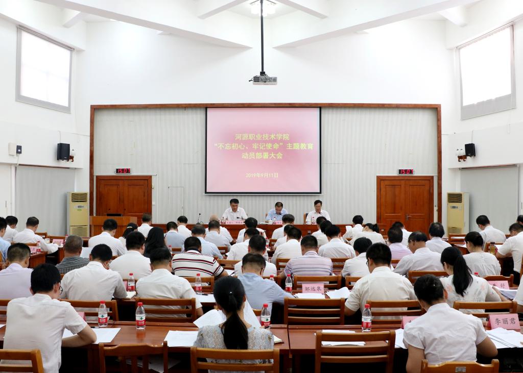 9月11日下午,我校召开“不忘初心、牢记使命”主题教育动员部署大会。党委书记韦荣作动员讲话,对全校主题教育进行部署。省委第十一巡回指导组副组长张永平到会并作指导讲话。学校党政领导班子成员、各部门正副职、校院二级专职组织员和各党支部书记参加大会。会议由陈德清校长主持。