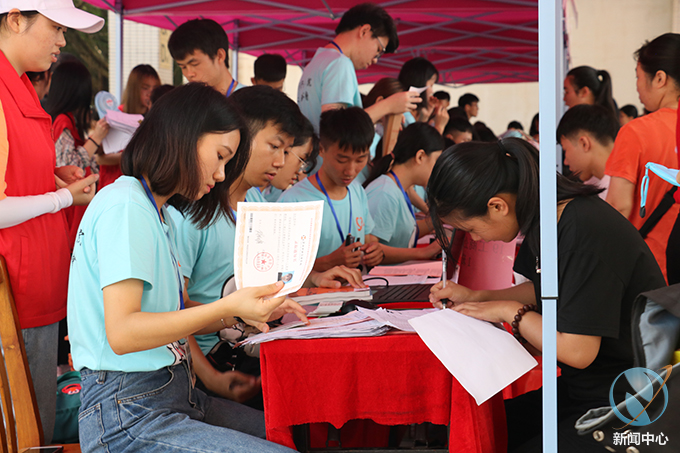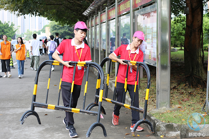 为了让新生可以更加方便、快捷地完成注册入学,我校在校外的河源市火车站、新城客运站等迎新报到点设立了接站志愿者队伍并且安排车辆接送新生到校,在校园内设立了新生引导志愿者队伍,热情积极的帮助到校新生提行李、带路、引导新生完成报到工作及入学事务;还设立了校内咨询服务站给新生提供咨询服务,为新生和家长担当校园导游,耐心地为新生以及家长答疑解惑,为新生介绍学校的环境及相关情况,帮助新生尽快了解和适应学校环境;在学校道路设立了校外车辆引导志愿者队伍协助保卫人员指挥交通,引导家长的车辆出入停放。此外学校还设立了多个学生家长休息区以及行李寄放区,为新生及家长提供休息等候的场所。各个岗位的志愿者身着鲜艳的红色短袖,不辞辛苦,认真工作,志愿者们以饱满的精神状态投入到迎新工作之中。