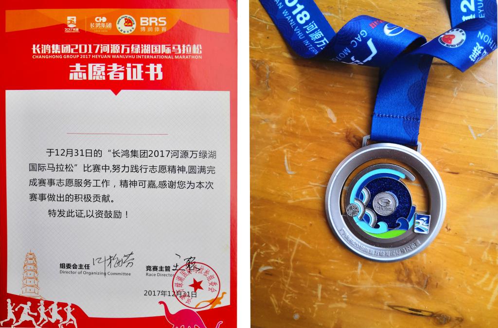 2017、2018年河源万绿湖国际马拉松赛志愿者服务证书和纪念牌