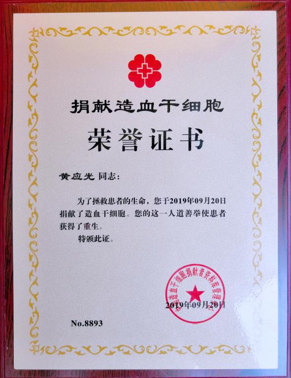 2019年5月,希望的种子在春雨滋润中偷偷发芽了,黄应光接到了河源市红十字会的电话,得知自己与一名淋巴瘤患者配型成功,他毫不犹豫地同意了。6月,顺利通过深度匹配。