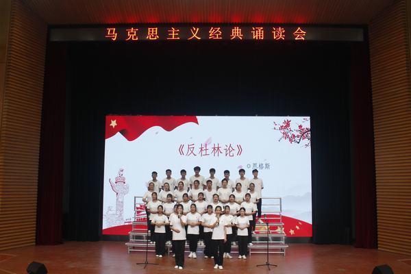 在诵读会中,各组学员以整洁的着装、饱满的精神轮番上阵,伴着婉转的旋律和铿锵有力的节拍,声情并茂地朗诵了《十九大报告》节选、《在纪念马克思诞辰200周年大会上的讲话》、《习近平在北京大学师生座谈会上的讲话》、《在纪念五四运动100周年大会上的讲话》、《习近平在纪念红军长征胜利80周年大会上的重要讲话》、《青年运动的方向》、《反杜林论》、《全体中华儿女的共同向往》等经典名篇。