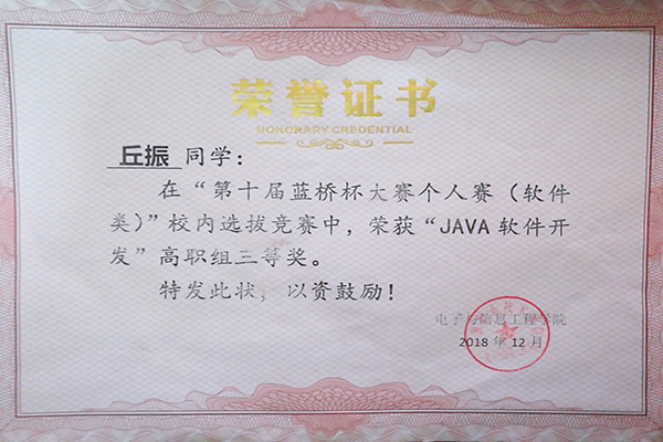 为锻炼自我,提高自身能力,丘振在大一期间踊跃报名学生组织和社团,尽管并未通过,但他永不气馁,重振旗鼓后将目光转向其他锻炼平台。在接下来的日子里丘振展现出自己坚韧不拔的优点,通过努力荣获星空在线(中国)唯一官方网站第十四届校运会象棋比赛“优秀裁判员称号”;第十届蓝桥杯大赛个人赛(Java软件开发)校内选拔三等奖;第八届河源市青年创新创业大赛优秀奖。