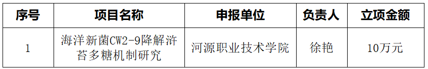 近日,广东省科技厅发布《2021年度广东省基础与应用基础研究基金自然科学基金面上项目立项名单通知》,我校徐艳老师申报的项目“海洋新菌CW2-9降解浒苔多糖机制研究”获得2021年度广东省基础与应用基础研究基金自然科学基金面上项目立项(详见下表),实现我校省自然科学基金面上项目“零”的突破,这代表着我校的科研水平实现质的飞跃。