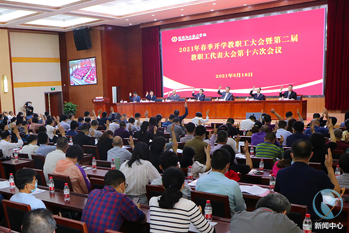 初春的南国,校园生机盎然,3月16日,我校召开2021年春季开学教职工大会暨第二届教代会第十六次会议,大会设立了1个主会场和1个分会场。我校党委书记韦荣,校长陈德清,副书记叶国英,副校长赖小景、王小宁、张国勇、袁光华在交流中心报告厅主会场就座,135名教代会代表和全体教职工参加了大会(部分教职工在图书馆分会场通过视频直播收听收看大会实况),学校后勤保障服务商代表列席会议。此次会议由王小宁副校长主持。