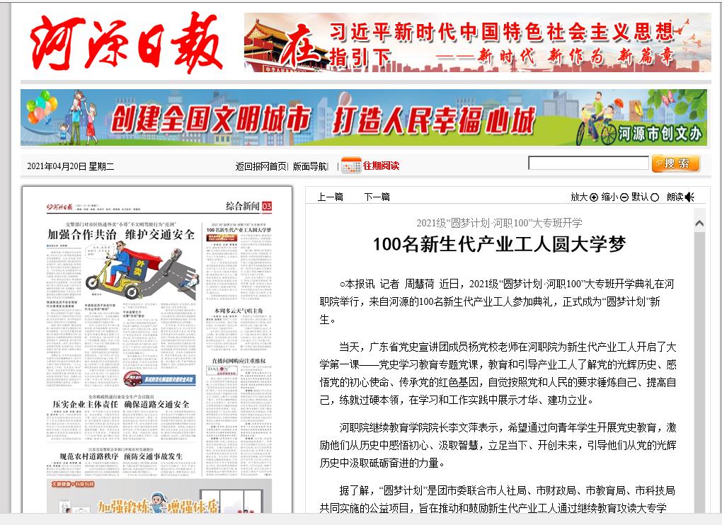 6、2021年4月21日,河源晚报报道《建党百年,百名工人进高校圆大学梦助推河源发展》,报道网址链接:http://www.heyuanxw.com/2021/ms_0421/69258.html