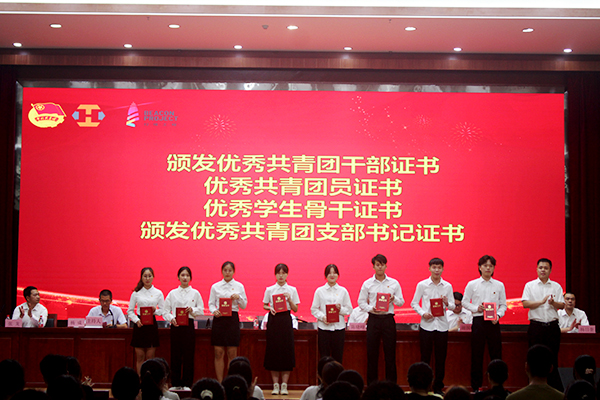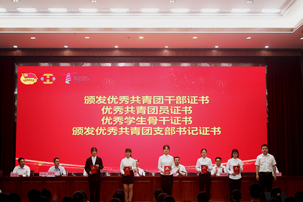 会议在庄严肃穆的国歌中拉开序幕。赖小景副校长分别为广东省优秀共青团员黄冬婷、省优秀学生会工商管理学院、河源市优秀团干部杨日奎书记、优秀共青团员陈慧婷颁发荣誉证书。会上,宣读了《星空在线(中国)唯一官方网站2021年五四表彰决定》,并为受表彰的先进集体和先进个人颁奖。