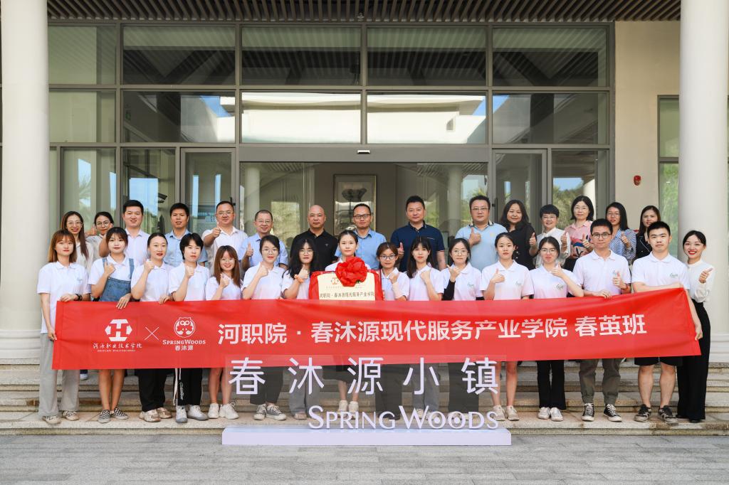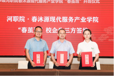 开班典礼上,叶国英副书记,俞彤院长、张颖副院长,春沐源集团胡奎然副总裁、运营中心人力资源陈田华总监,学生代表罗金凌等校企生三方共同揭牌,并为学员颁发了录取通知书。胡奎然副总裁、俞彤院长代表校企双方签约“春茧班”人才培养校企合作协议。随后,在全体人员的见证下,校企生三方代表签署了“春茧班”培养三方协议。