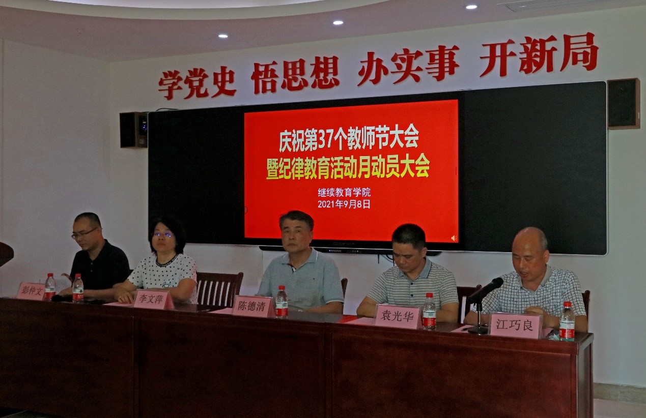 9月8日,继续教育学院召开2021年庆祝教师节大会暨纪律教育学习月活动动员会。陈德清校长、袁光华副校长、相关部门负责人及继续教育学院全体人员参加会议。继续教育学院江巧良副院长主持会议。
