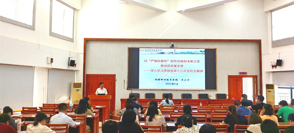 会上,王小宁副校长以《以“严细实新好”的作风做好本职工作 推动高质量发展》为主题,带领学院全体教职工深入学习贯彻省第十三次党代会精神。王小宁指出,省第十三次党代会将忠诚拥护“两个确立”、坚决做到“两个维护”作为主线贯穿始终,充分展现广东始终不渝沿着总书记指引的方向奋勇前进的决心和意志。省第十三次党代会与时俱进深化“1+1+9”工作部署,集中全省智慧形成推动新时代广东改革发展的具体行动方案和施工图,体现了一张蓝图绘到底的精神。王小宁认为,结合实际,坚持以省第十三次党代会精神指导推动工作,必须做到:1.坚持党建引领,坚持社会主义办学方向;2.以“双高”建设为抓手,推进学校高质量发展;3.以创建广东省文明校园先进学校为抓手,坚定文化自信,增强历史自觉,进一步推进文化强校;4.以创建“平安校园”为抓手,坚决守住校园安全底线。王小宁强调,落实各项职责与任务,必须继承和发扬优良的工作作风,做到:1.严以修身,坚定理想信念;2.细以管理,注重周到服务;3.实以避虚,体现担当作为;4.新以敢闯,坚持与时俱进;5.好以完美,追求精益求精。王小宁要求学院全体教职工,以省第十三次党代会为新起点,更加紧密地团结在以习近平同志为核心的党中央周围,把思想统一到省党代会部署上来,把干劲集中到落实省党代会部署上来,以实干体现担当,以实绩彰显忠诚,以优良成绩迎接党的二十大的胜利召开,向着更美好的明天奋进。