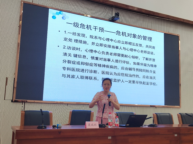 梁瑞琼教授根据省教育厅近年来发布的心理健康教育工作文件指导出发,指出心理健康测评、心理访谈、心理危机事件防范工作的重要性,强调需加强学生心理健康识别、心理健康测评、访谈筛查、分类疏导,并建立预警与干预机制。梁教授详细讲解了常见心理测评问卷的使用方法、结果分析等具体可操作性的技术,测试后的学生心理访谈工作的谈话技巧,如何分级分类管理需关注的学生,对不同等级的学生采取相应的访谈技术和管理应对方法。为我校心理健康教育工作传授了专业性、科学性、规范性的实践操作技术。