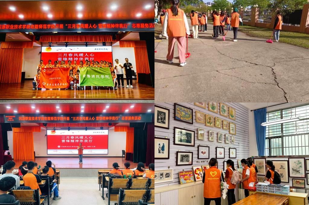 工商管理学院团委联合中国人民银行,在学校东门进行反洗钱及金融相关的法律法规知识的宣传活动,通过派发宣传单等方式,让群众了解日常金融知识;组织学生志愿者做好2024年河源国家高新区企业高质量发展大会大型会务服务工作。人文艺术学院团委组织志愿者,前往深河医院开展义务导诊志愿服务活动,用青春力量为就医患者提供便民服务。机电学院团委组织“河小青”志愿服务队前往美丽的东江河畔,开展护绿护水志愿服务活动,用实际行动助力绿美河源建设。电信学院团委开展家电义务维修进小区志愿服务活动,用专业知识切实为小区居民解决生活难题。老隆师范学院团委组织学生志愿者服务队,前往市博爱学校开展送爱心送温暖活动,通过文艺表演的形式为博爱学校同学们带去美好祝愿,传递积极向上的精神风貌,践行雷锋精神。校国旗护卫队前往东江首付标点幼儿园开展“大手拉小手”国旗知识进校园志愿活动,通过举行升旗仪式、操练展示,让国旗的星光照耀在孩子身上。