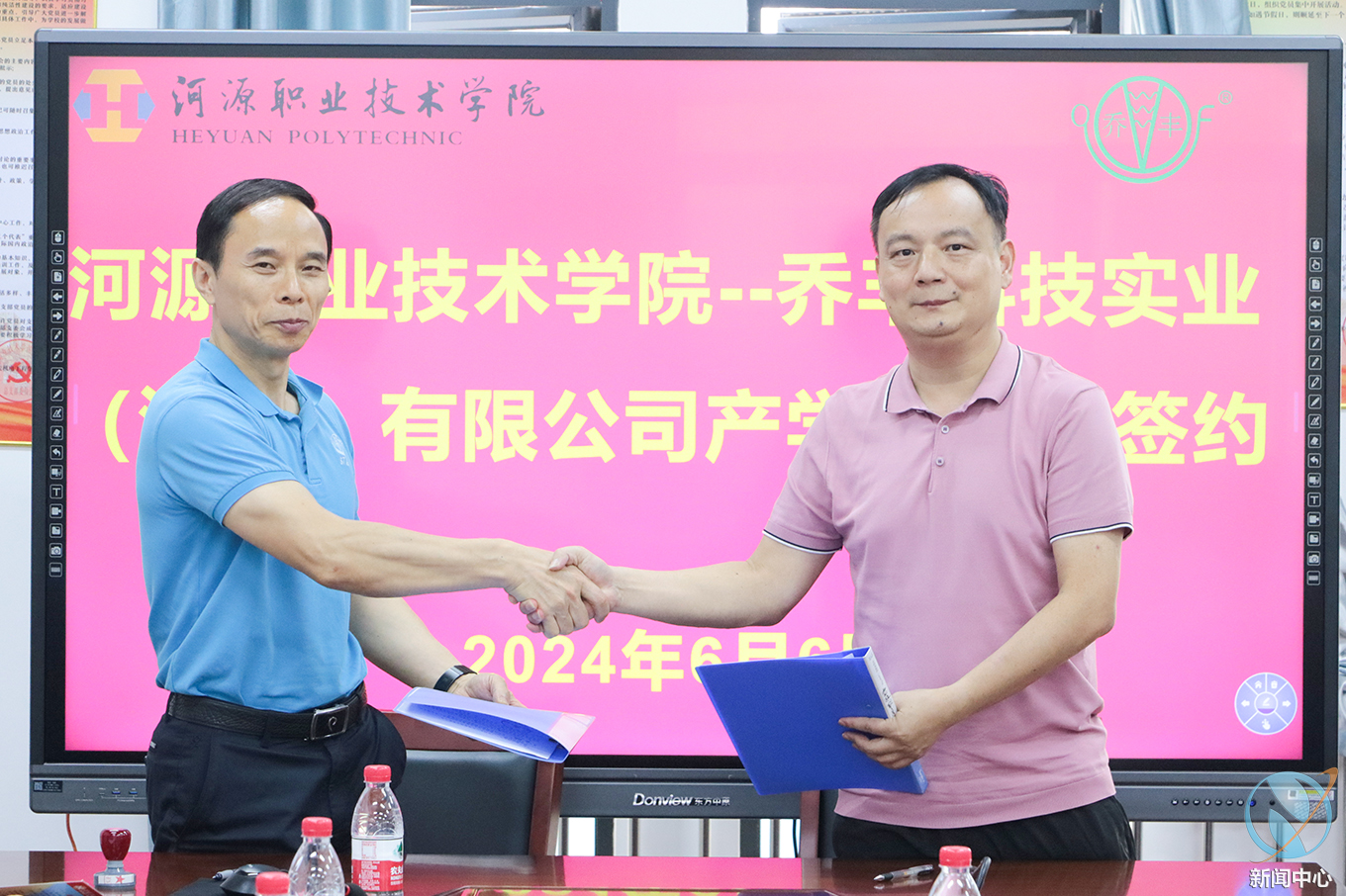 6月6日下午,乔丰科技实业(河源)有限公司(以下简称乔丰科技公司)董事长刘海杜一行来访我校,与学校签订校企合作协议。韦荣书记、科研处廖远兵处长、机电工程学院相关人员参加活动。