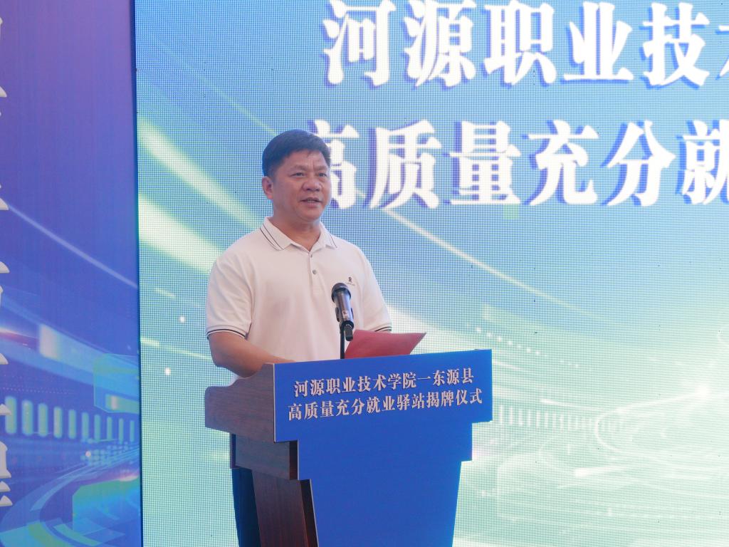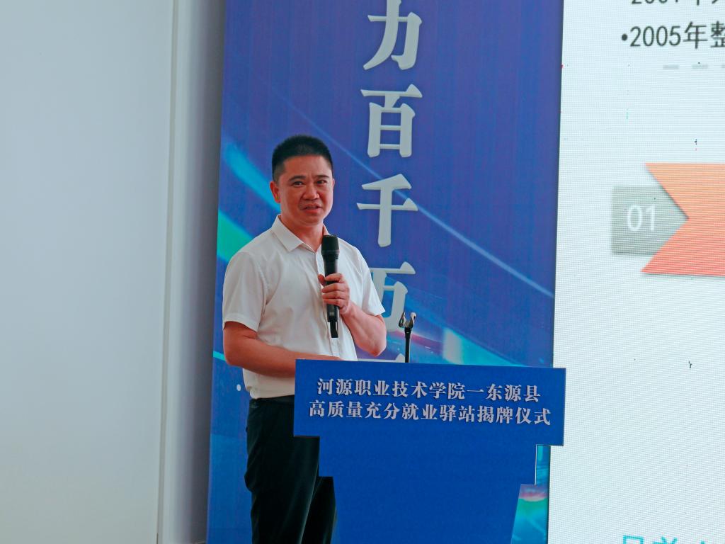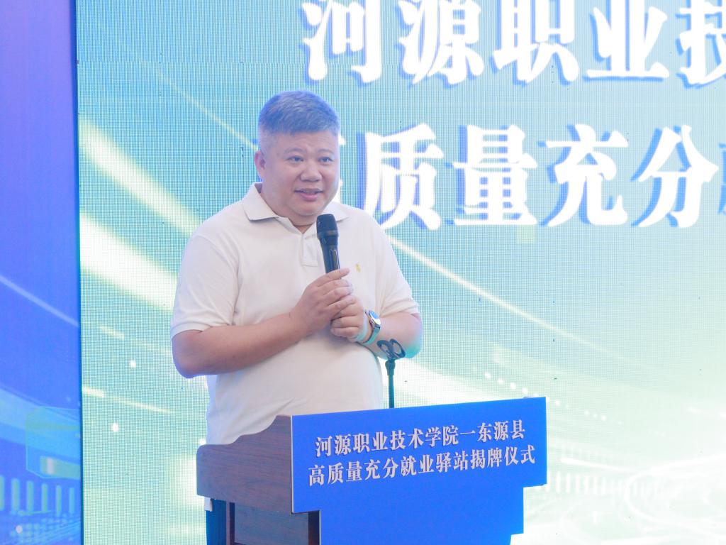 仪式伊始,东源县新时代和美乡村研究院院长林荣斌介绍了“高质量充分就业驿站”的建设背景。他回顾了研究院近年来在创新创业方面所取得的成绩,并对未来与我校的合作充满了期待。他表示,通过此次合作,双方将共同打造一个集实习实训、就业创业、产学研合作于一体的综合性平台,为学生提供更加广阔的实践空间和更加丰富的职业选择。