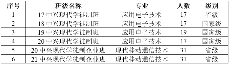 自2016年至今,已经举办5届中兴订单班、6个现代学徒制班,其中我校应用电子技术专业于2017年开始开展现代学徒制省级试点,组建“中兴现代学徒制班”;2018年成为现代学徒制国家第三批试点专业,并于2021年10月通过验收。2019年河职院-中兴通讯立项为广东省大学生校外实践基地;2020年中兴通讯(河源)有限公司获广东省第一批建设培育产教融合型企业称号;2021年,我校与中兴通讯产教融合协同育人项目获得广东省职业教育“十三五”产教融合优秀案例。中兴通讯股份有限公司为我校校企合作委员会常务理事单位,多次获得校企合作先进单位和先进个人;2020年11月,我校与中兴通讯签订完成了合作共建“中兴通讯数字化产业学院”的协议;2020年12月,“中兴通讯数字化产业学院”被认定为校级现代产业学院。