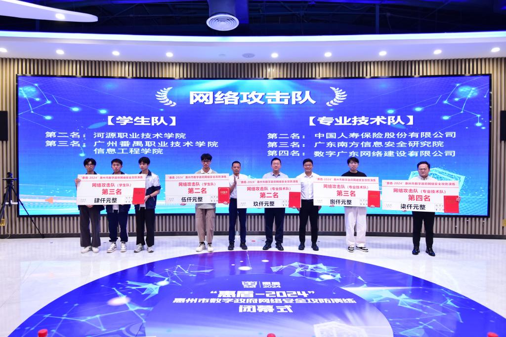 6月25日下午,“惠盾-2024”惠州市数字政府网络安全攻防演练活动闭幕式在惠州电信“互联网+”基地举行,广东省政务服务和数据管理局党组成员魏文涛、惠州市政协副主席胡雪平出席活动。我校派出的学生队伍在此次网络安全攻防演练中表现突出,总分成绩排在学生组第二名,学校荣获优秀网络攻击队。