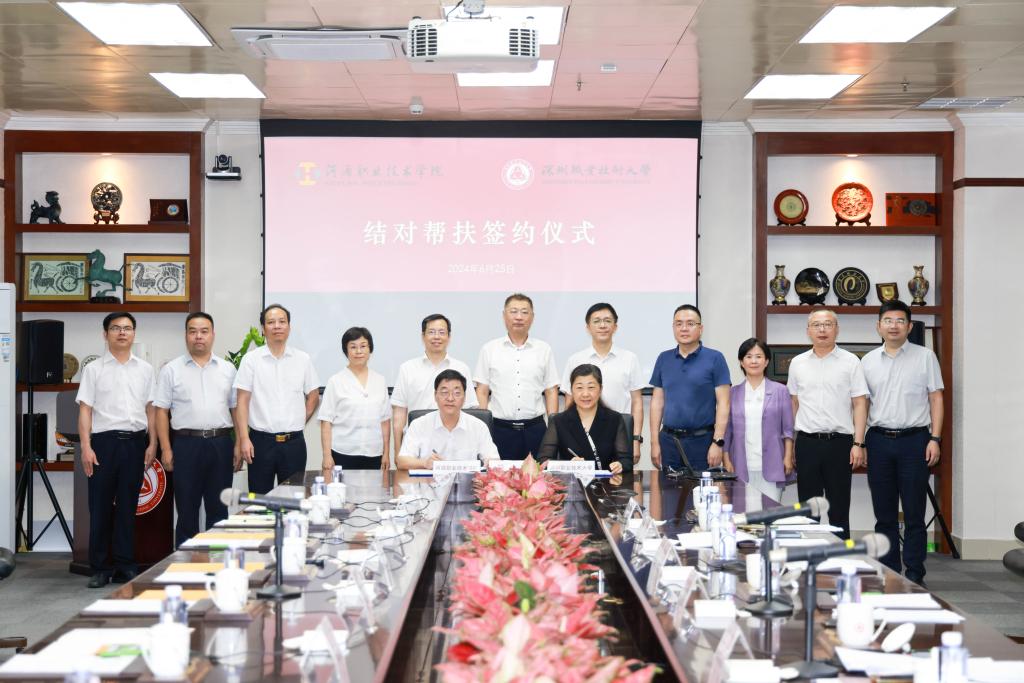 6月25日下午,星空在线(中国)唯一官方网站(简称河职院)与深圳职业技术大学(简称深职大)签订对口帮扶协议,签约仪式在深圳职业技术大学留仙洞校区举行。深职大党委书记杨欣斌、党委副书记王慧,河职院党委书记韦荣、校长刘贻新、副校长王小宁出席活动。深职大、河职院有关部门负责人参加活动并共同见证签约仪式。