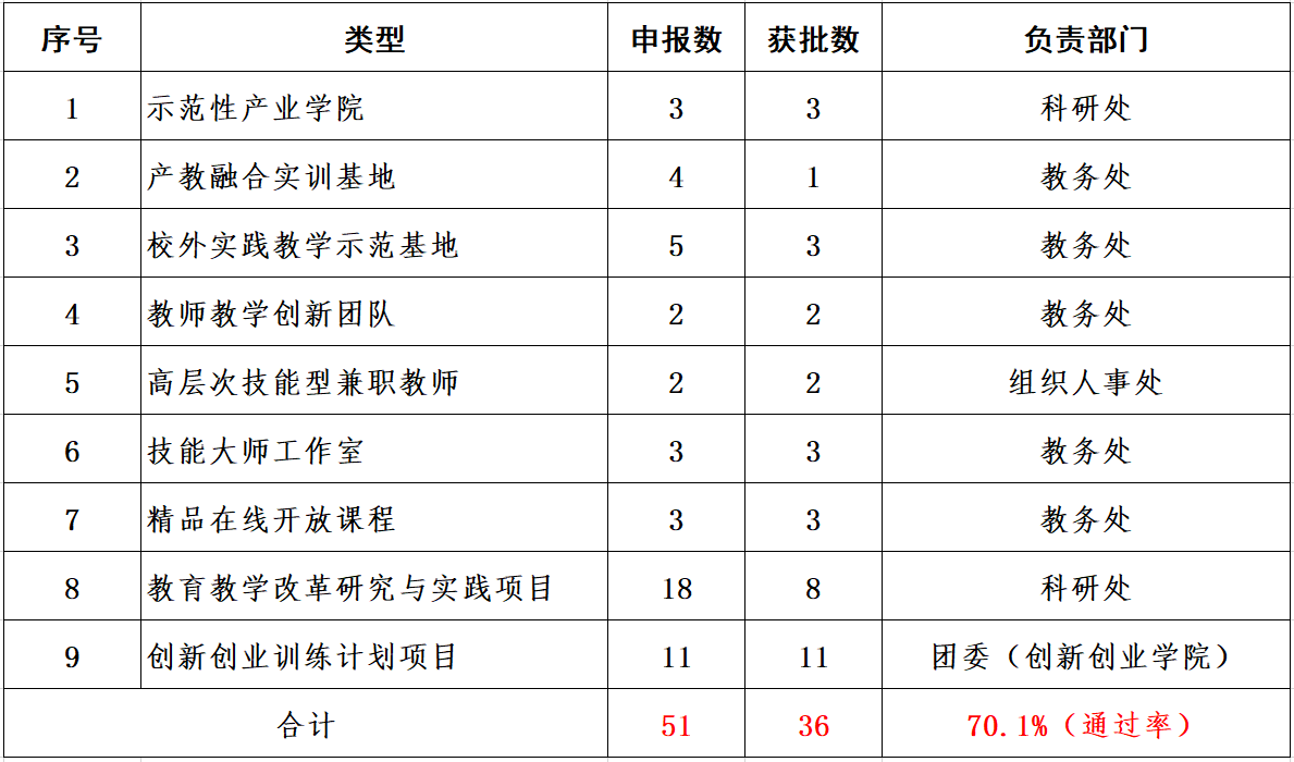 日前,广东省教育厅公示了2023年省高等职业教育教学质量与教学改革工程(以下简称“质量工程”)项目评审结果,我校申报了9大类51项,其中36个项目获得通过,通过率为70.1%,实现大面积丰收。具体情况统计如下: