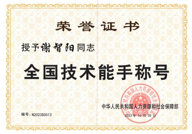 图3 团队成员谢智阳副教授获“全国技术能手称号”