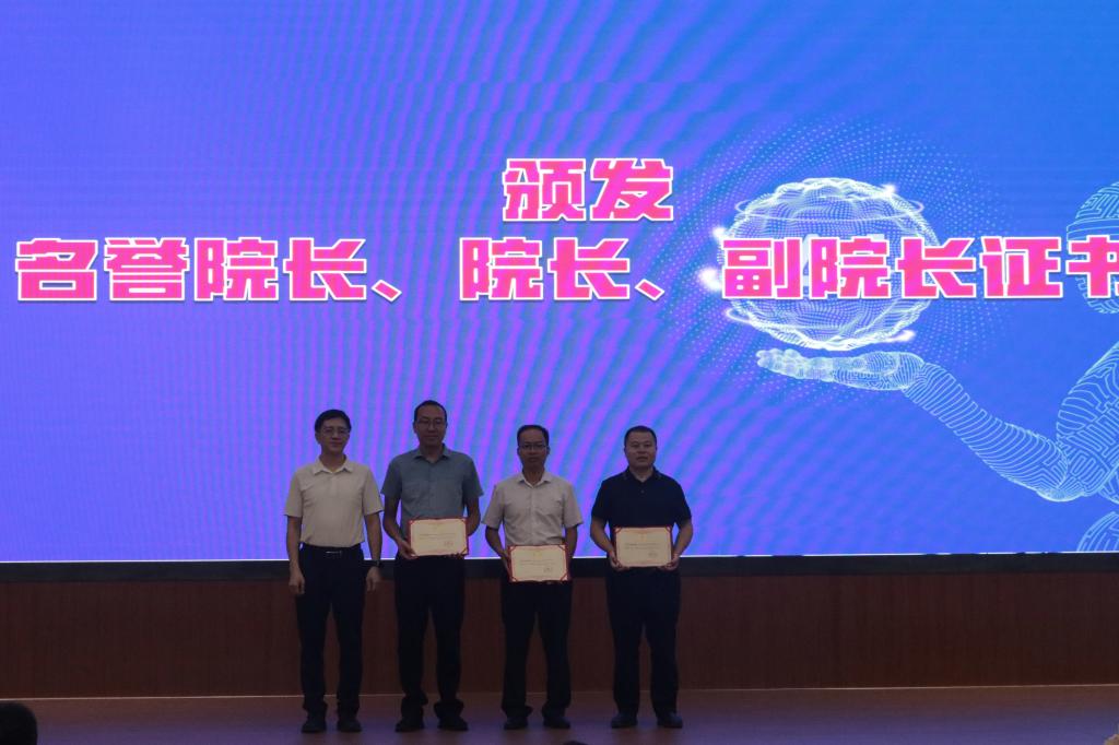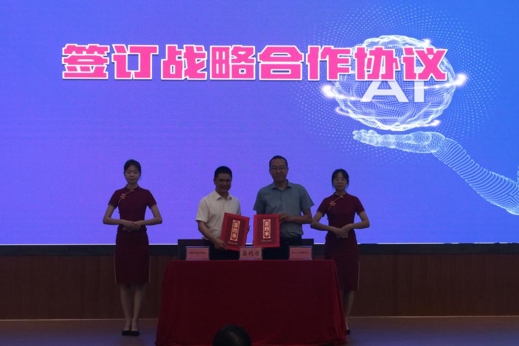 随后,雷渠江教授、刘贻新校长、市直有关单位负责人等上台共同为AI技术应用研究院揭牌;袁光华副校长和雷渠江教授签订了战略合作协议;刘贻新校长为AI技术应用研究院名誉院长雷渠江教授、院长叶红卫教授、副院长周永福副教授颁发了证书。