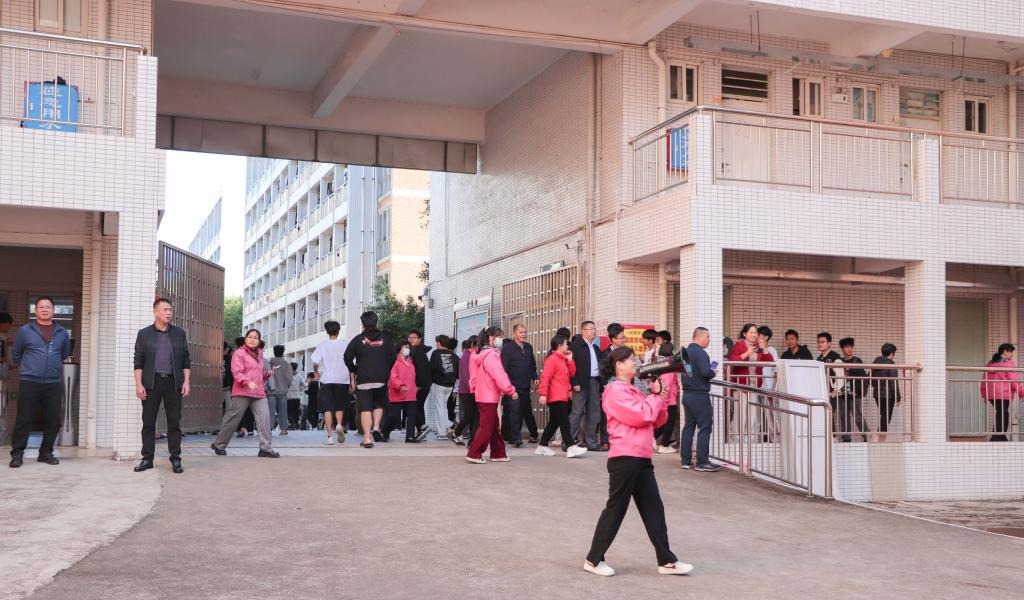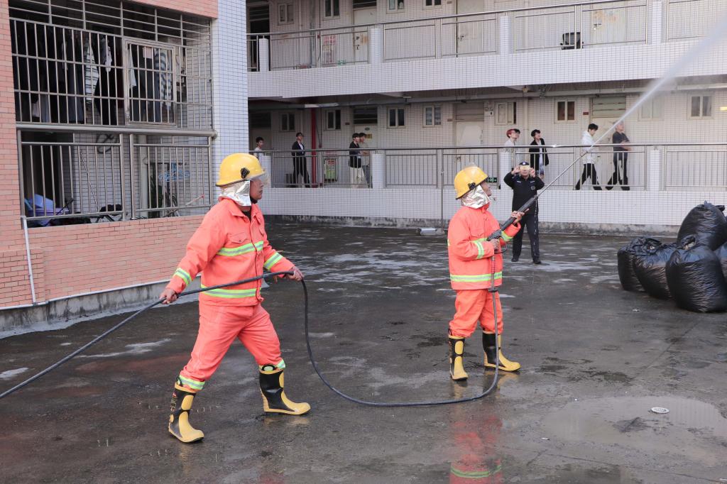 工作人员投放烟雾弹模拟消防工作演练。随着警铃声响起,浓烟弥漫,工作人员引导和指挥安排疏散学生,学生捂住口鼻,降低身姿逃生,并有序地撤离学生宿舍至安全地带。微型消防队到达现场,消防员进入大楼架设水枪浇灭火灾。