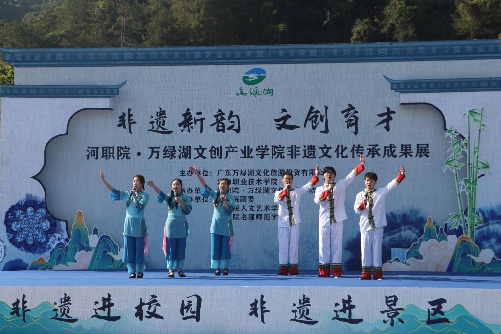 为进一步弘扬和宣传河源优秀非遗文化,展现人才培养及校企合作、产教融合的成果,12月20日,主题为“非遗新韵 文创育人”的河职院·万绿湖文创产业学院非遗文化传承成果展在万绿湖码头举办。河源市文化广电旅游体育局副局长李君,学校副校长袁光华、姚家芳、科研处处长廖远兵、校团委书记陈晓峰、人文艺术学院院长罗春娜,东源县委组织部副部长何文健、市文电旅体局非遗科副科长黄维玮、广东万绿湖文化旅游投资有限公司董事长周维国、忠信花灯非遗传承人赖秀山以及广东万绿湖文化旅游投资有限公司相关人员、人文艺术学院师生代表、老隆师范学院师生代表等参加活动。