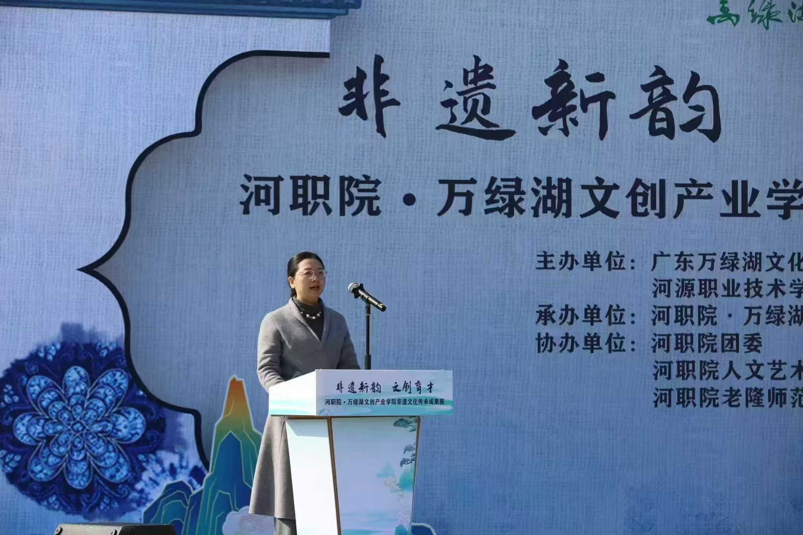 学校副校长袁光华在致辞中表示,我校历来高度重视与地方优秀企业开展校企合作、产教融合。万绿湖与我校开展校企合作20年,合作成果丰硕,希望在未来的发展过程中,双方借助于文创产业学院这一优质合作平台,继续深化合作、筑牢协同根基,特别是在课程体系建设、师资队伍共享、人才体系培养、科研社会服务以及文创产品研发、创新等方面,致力于培养更多的河源文创产业人才,为河源非遗文化的传承、创新发展以及社会经济的高质量发展添砖加瓦。