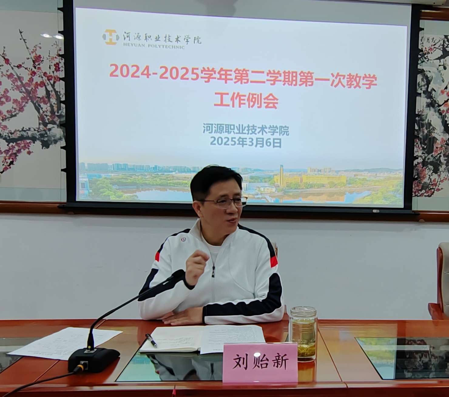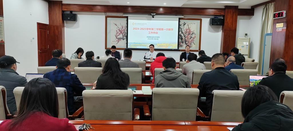 2025年3月6日下午,教务处在行政楼第一会议室组织召开2024-2025学年第二学期第1次教学工作例会。会议由袁光华副校长主持,会议以“教学工作高质量发展”为主题,围绕省域高水平学校建设、新国双专业群申报、教学管理优化等核心议题展开部署,为新学期教学工作指明方向。刘贻新校长,袁光华副校长,各二级学院正副院长,校企办主任及教务处相关人员参加会议。
