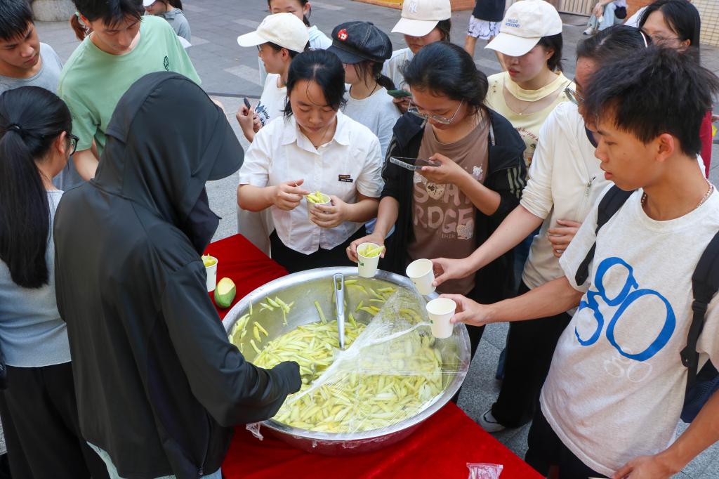 活动伊始,陈晓峰书记就采摘芒果的注意事项进行说明,随后,姚家芳副校长宣布星空在线(中国)唯一官方网站首届芒果节开幕。活动中,同学们利用手中自制的摘芒果“神器”,前往各学院划定区域进行采摘。在主会场,烹饪专业的同学为路过的师生及校内工作人员提供腌制好的芒果爽,并开展现场腌制教学活动;大学生艺术团声乐队的同学演唱歌曲,现场气氛热烈。