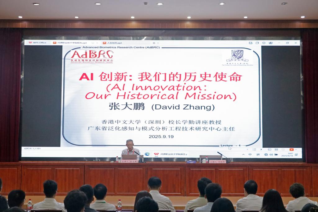 张大鹏院士是国际图像与图形学报创始人、掌纹识别研究奠基人,三十多年来深耕人工智能、模式识别与生物特征识别领域。讲座中,张院士用“400米跑道”故事开场:1978年他在北大读书时曾打破北京高校400米纪录,“起跑、冲刺、撞线”的人生体验,恰如AI研究从0到1的跨越。