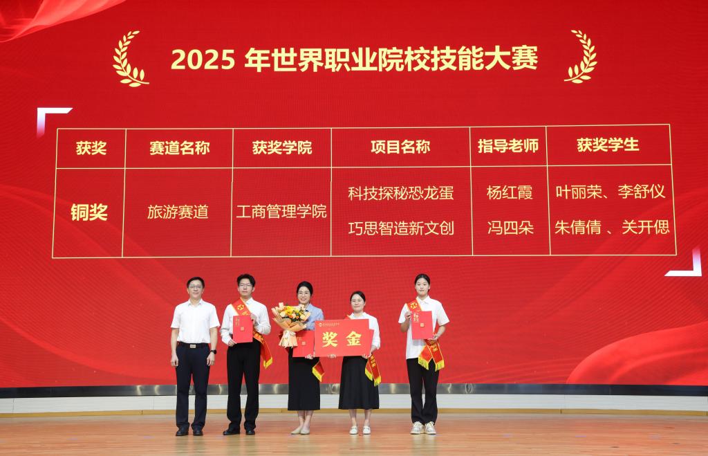 工商管理学院22旅游管理1班优秀毕业生陈钰婷发言,她深情回顾了在校期间参加世界职业院校技能大赛的成长历程。她特别感谢指导教师伍新蕾及其他老师的辛勤付出,从大一时普通话不标准、上台紧张,到后来获得世校赛金奖、全国赛第七名等优异成绩,离不开老师们经常陪练到深夜、一字一句纠正发音、一个动作打磨展示的悉心指导。她表示这份荣誉属于每一个深夜亮灯的实训室和每一句“再来一遍”的坚持,更属于老师们重于泰山的付出,并代表所有获奖同学向老师们致以最诚挚的感谢。