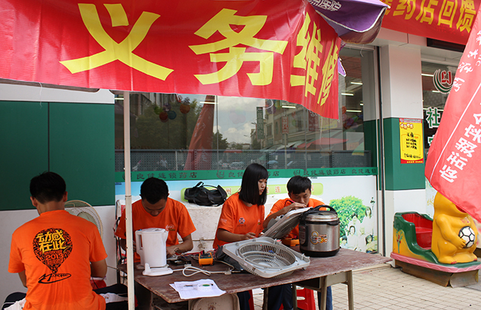 义务维修队是我校“三下乡”社会实践活动的品牌项目之一。活动开展期间,义务维修队分别在凤安镇以及觉民村树围、白云、河塘三个村民小组开展了义务维修活动。义务维修队采取上门和定点设摊两种方式开展维修,尽心尽力地为村民排忧解难,村民们足不出户就享受到了免费维修。记者在各维修点看到,前来维修各种电器的村民络绎不绝,志愿者顶着炎热的天气坚守在工作岗位为村民服务。截止28日,义务维修队共接收电风扇、电饭煲等需维修的家用电器249件,修好了226件,成功率达90.8%。