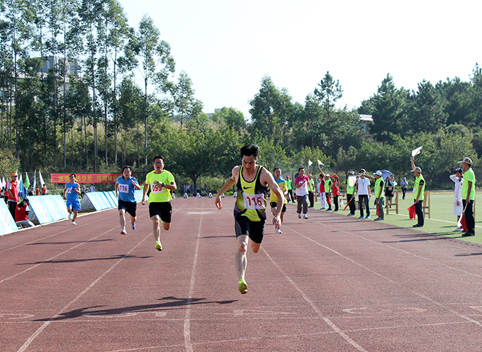 当比赛的哨音响起,各位教职工在起跑线前热身完毕,便绷紧全身的每一根神经。发令枪响,全场的气氛都被点燃了,跑道上的教职工们如脱缰的野马一样飞出去,如八道闪电向终点掠去。古伟民老师从出发起便一马当先,只见他不断加速,转眼间,他便冲过了终点,以11秒71获得本项目冠军。来自机电学院的易志华老师和机关工会的黄志远老师,分别以12秒84以及13秒52的成绩分获亚、季军。