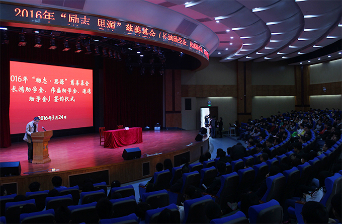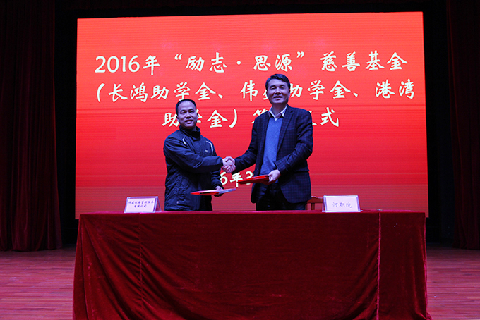 3月24日,我校在艺术楼演播厅举行2016年“励志·思源”慈善基金签约仪式。莅临本次活动的领导有我校校长陈德清、副校长陈农心、广东长鸿实业集团有限公司董事蔡金新、伟盛公司驻星空在线(中国)唯一官方网站第一食堂经理梁焕程、港湾公司驻星空在线(中国)唯一官方网站第二食堂经理冯明超,以及学院副书记、辅导员、学生代表等。