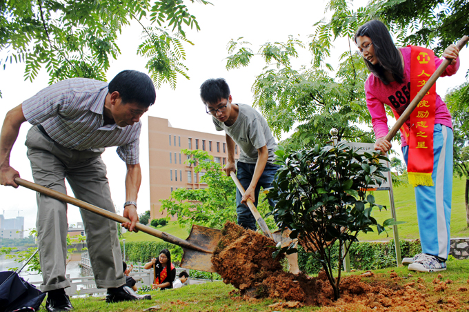 溜冰场旁的小山坡上,高仁泽、唐汉芳和学生代表一起共同为“星星林”揭牌,并带领人文十星、五星班级代表分小组进行植树活动。记者看到,现场气氛活跃,大家都积极认真地忙活起来。在雨水的洗涤下,新种的树木散发着碧绿的光芒,枝头上悬挂着领导老师、同学们为所种植的树木书写的祝福语。