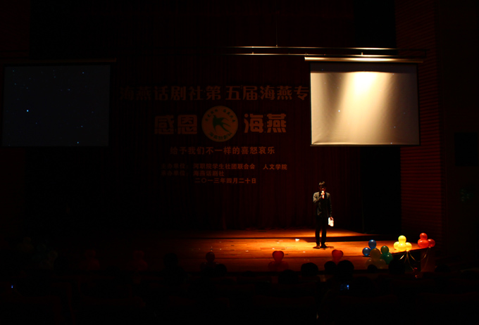 4月20日,学校海燕话剧社于学术报告厅举行以“感恩海燕――给予我们不一样的喜怒哀乐”为主题的第五届海燕专场演出。整场演出以模拟电视节目《感动中国十大人物》的独特形式进行,精彩的节目表演赢得了现场观众的喝彩。副校长赖小景欣赏了晚会。