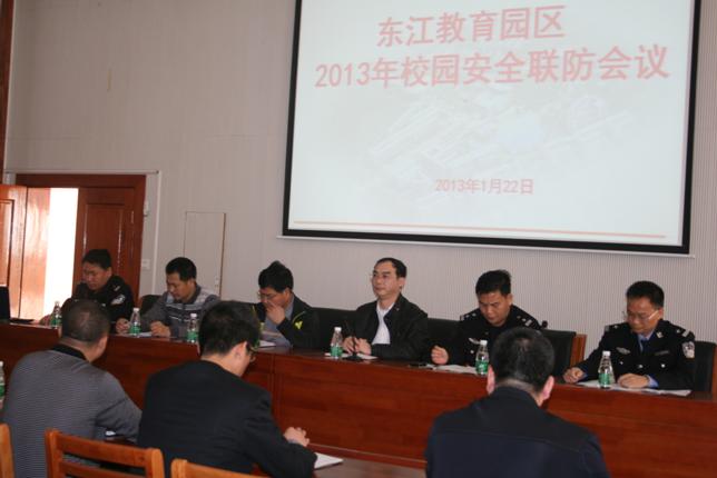1月22日下午,东江教育园区2013年校园安全联防工作会议在我校行政楼C108会议室召开,副校长赖小景,市技工学校、市理工学校、胜利村联防、商业街华达物业管理公司、中竣物业管理公司有关负责人出席会议。