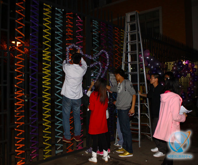3月6日晚上21:30,一群身影便忙碌于学校各女生宿舍区楼下。记者看到,每栋女生宿舍玻璃门挂上了心型的玫瑰花圈,并贴上了“女生节快乐”的字样,进出宿舍的女生都收到了男生们精心准备的玫瑰花。B区宿舍大铁门还缠绕着各色的彩带,古板的铁门顿时有了生气。在宿舍区过道的每棵树上同样悬挂着彩色的气球,装扮一新的宿舍区显得格外温馨甜蜜。