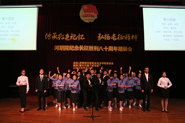 据悉,此次典礼旨在倡导我校广大团员青年学习先进,争做“六有”大学生。此次汇报演出与我校纪念长征胜利八十周年朗诵会相结合,以诗歌朗诵的形式缅怀红军长征的伟大壮举,宣传长征的伟大精神,激发学员们的爱党爱国热情。