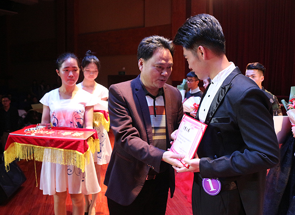 河源市山歌剧团团长欧阳山为校园歌手第二名李希博颁奖