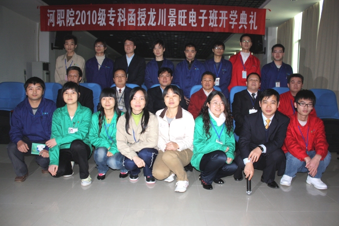 12月26日,河职院专科函授景旺电子龙川有限公司应用电子班2010级新生开学典礼在龙川景旺电子有限公司举行,该公司人力资源部梅凯经理主持典礼,龙川景旺电子有限公司廖怡杰总经理、我校继续教育学院及电信学院有关负责人出席了典礼。