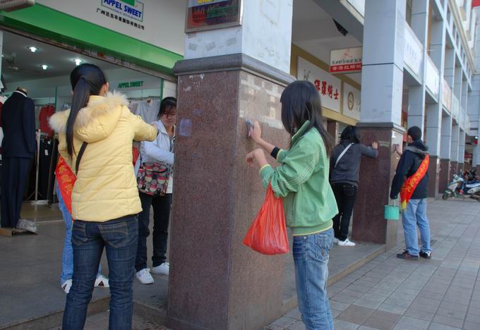 3月14日,我校师范学院青年志愿者服务队和学生会代表走上市区,走进街道,对卫生“死角”、“牛皮癣”等黑色广告进行清理。