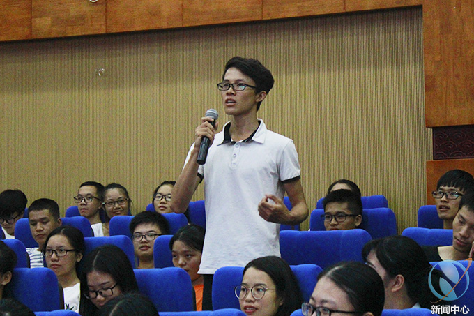 互动交流环节,韦荣书记认真为学生解答疑难困惑,为学生点亮理想信念之灯,开启美好的大学生活。