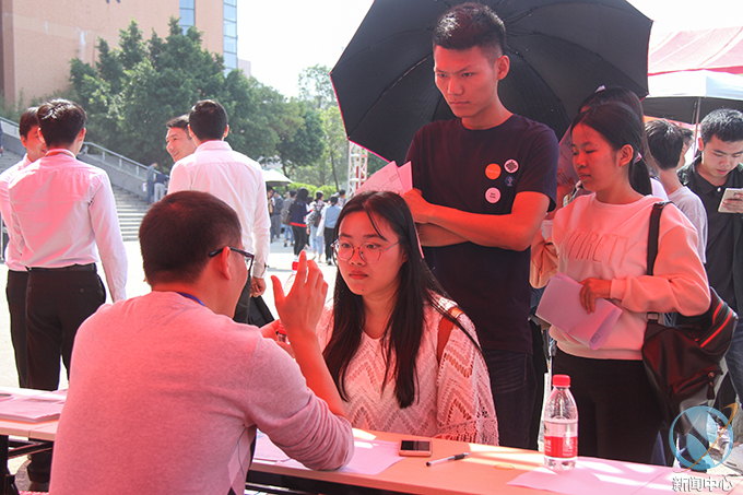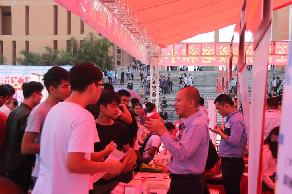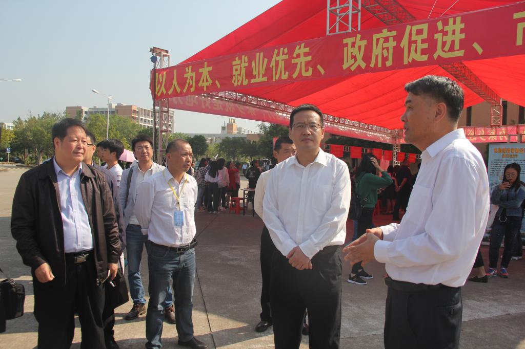 10月26日,我校在图书馆门前广场举办2018届毕业生河源企业专场校园招聘会。市委常委、副市长、深圳对口帮扶河源指挥部总指挥、市高新技术开发区党工委书记王卫在我校党委书记韦荣、校长陈德清、副校长陈农心等领导陪同下,亲临招聘会现场,了解企业的人才需求和毕业生应聘情况,对我校加强政校企合作,促进就业的做法给予充分的肯定。