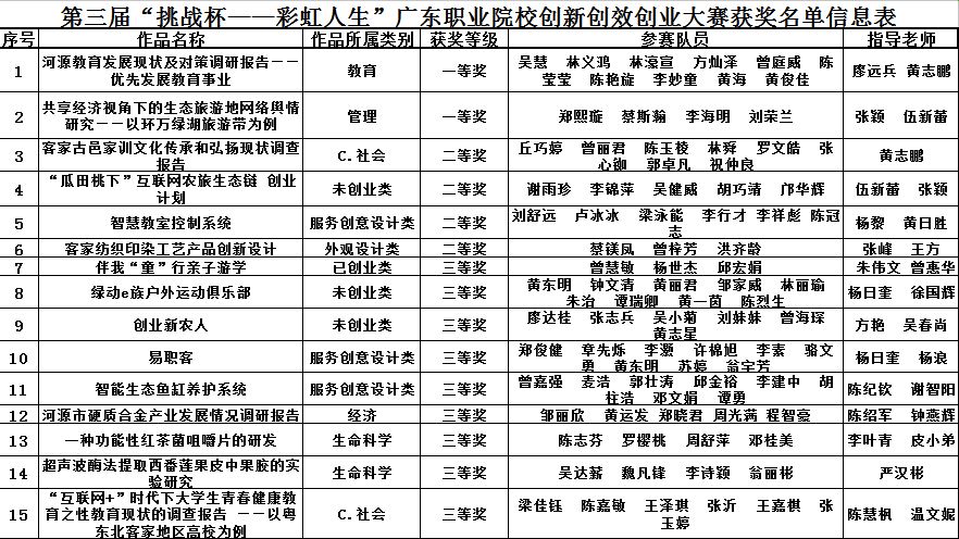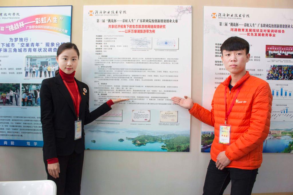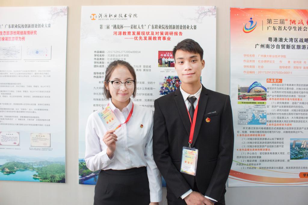本届“挑战杯——彩虹人生”广东职业学校创新创效创业大赛是由团省委、省教育厅、省科技厅、省科协、省学联主办的一项具有导向性、示范性和群众性的创新创业创效竞赛活动。共设置创意设计竞赛、创业计划竞赛、生产工艺革新与工作流程优化竞赛和社会调研论文竞赛四大类别,本届大赛共有103所职业学校、1268件参赛作品参加竞逐,省级参赛人数超6000人,参赛作品和人数均创省赛的历史新高。在本届“挑战杯”中,经过书面评审、现场答辩等形式的激烈竞争,我校进入终审决赛的15支参赛队伍凭借突出的创新成果、熟练的操作技能和出色的应战能力在103所职校中脱颖而出。其中,社会调研论文竞赛两个作品“河源教育发展现状及对策调研报告——优先发展教育事业”和“共享经济视角下的生态旅游地网络舆情研究——以环万绿湖旅游带为例”荣获大赛一等奖。