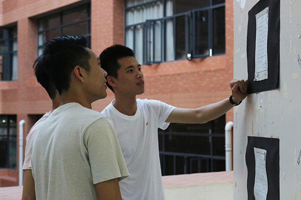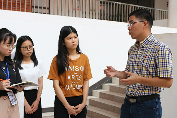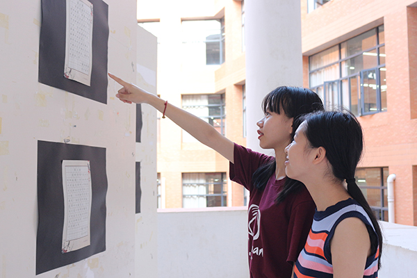 活动伊始,在我校至善硬笔协会工作人员的陪同解说下,黄志鹏副书记一行逐一观赏每一幅作品,并给予其高度赞扬及肯定。在参观期间,黄志鹏副书记也从形式内容等方面提出建议,他指出,要勇于发挥形式多样性内容丰富性的特点,联合其他协会共同策划举办,组织更新颖多样的比赛活动;也可通过订阅号的推送宣传,以此拓宽学生的参与面,加大活动的影响力。