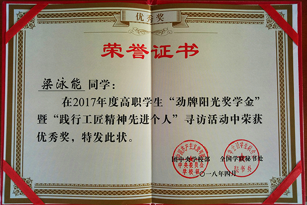 我校梁泳能同学喜获2017年度高职学生“劲牌阳光奖学金”暨“践行工匠精神先进个人”寻访活动优秀奖