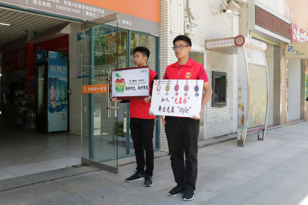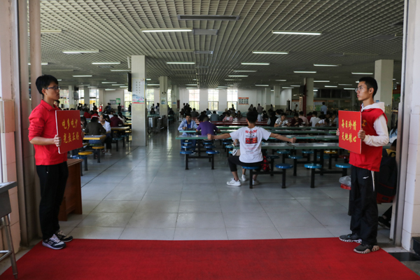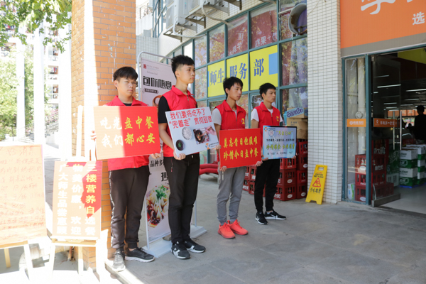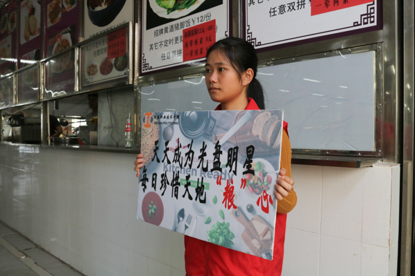在光盘行动中,志愿者身穿红色的志愿服在食堂门口进行分点站岗,手持光盘行动宣传展板,向广大师生宣传“光盘活动”的主题及意义,倡导就餐师生文明用餐。